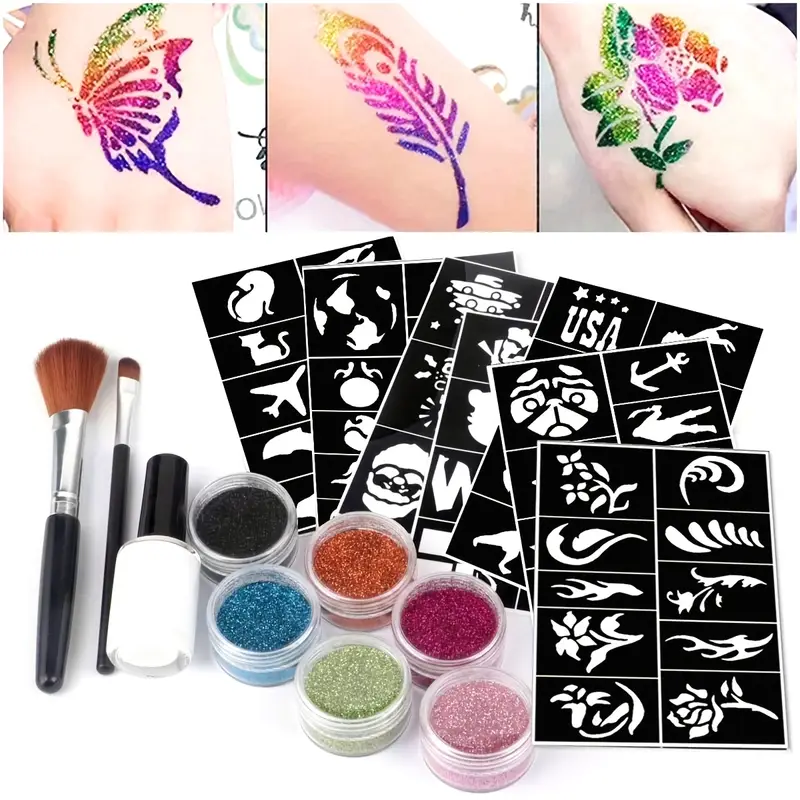 Temporary Glitter Tattoo Kit – 14 Stencils & 6 Glitters